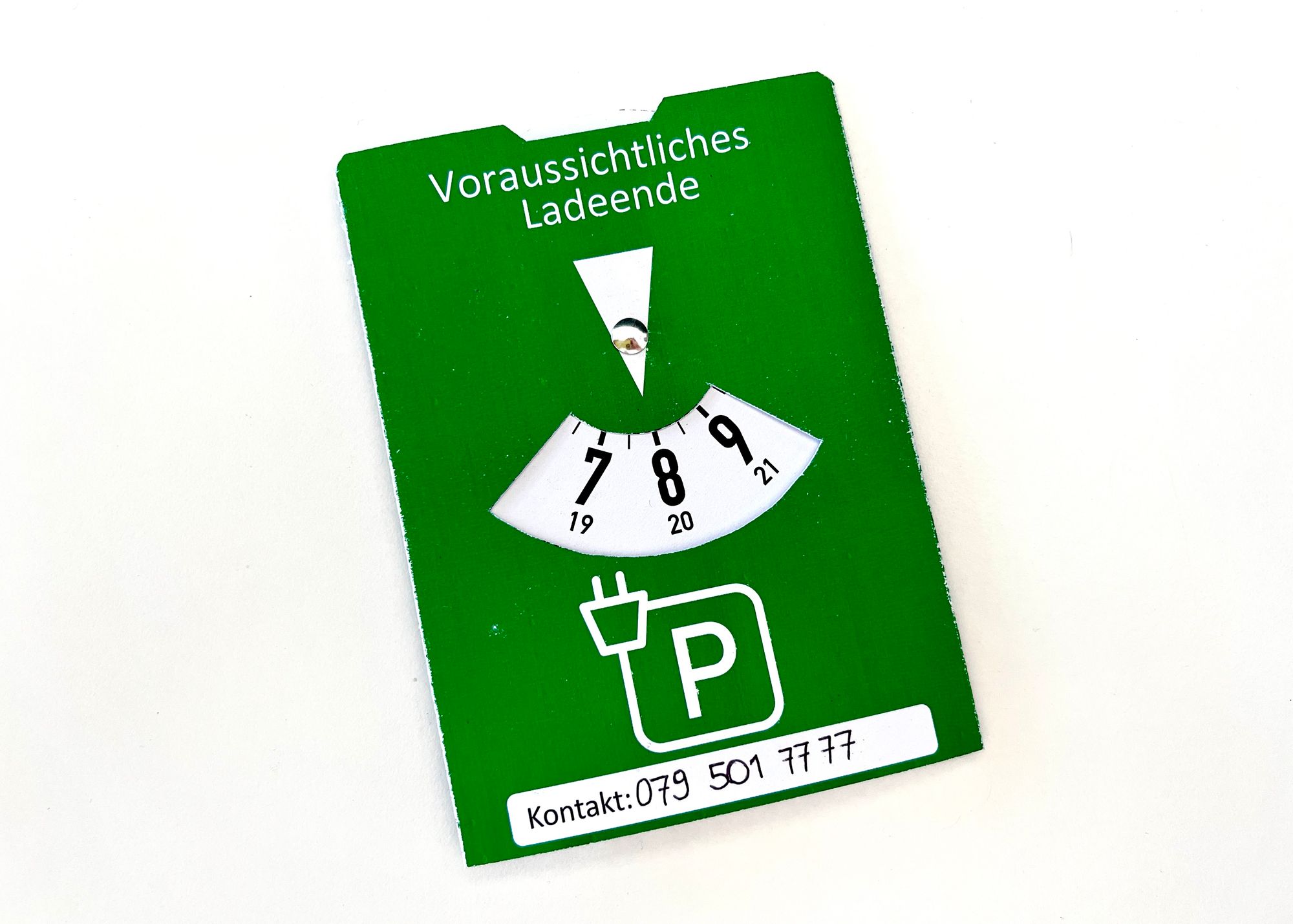 Die Ladescheibe funktioniert genau gleich wie eine Parkscheibe, nur ist sie grün und anstelle der Ankunftszeit, gibt man die Zeit an, wenn der Ladevorgang voraussichtlich abgeschlossen ist. Solche Ladescheiben gibt es im Internet zu kaufen, oder man lädt sich eine entsprechende Vorlage und bastelt sich die Karte selber.