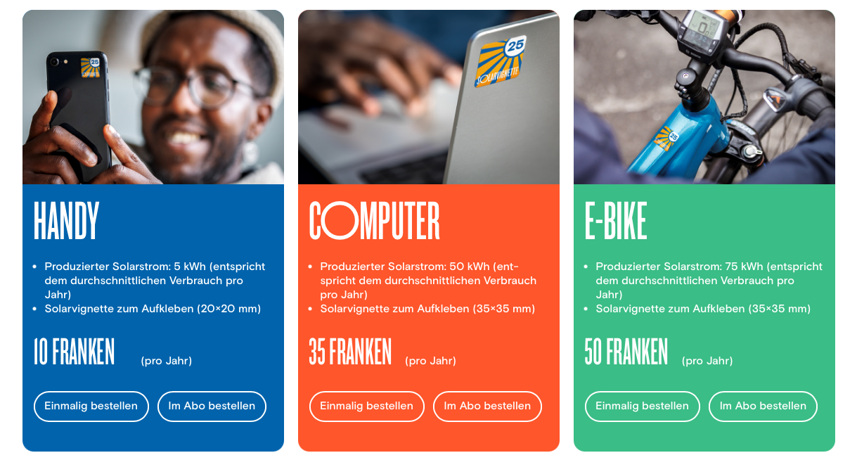 Es gibt Solarvignette in unterschiedlichen Grössen und Preisen. Du finanzierst damit einen Teil einer Solaranlage in der Schweiz und gleichst damit den Stromverbrauch des von dir gewählten Gerätes aus. Beispielweise ein Handy, ein Computer, das E-Bike, Elektroauto und so weiter. Es gibt die Vignette als einmaligen Kauf für 2025 oder als jährliches Abo.