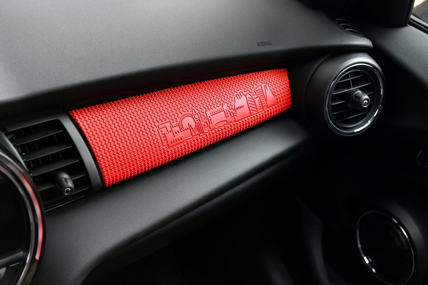 Die Dekorleiste lässt sich in die Armaturentafel des MINI 3-Türer, MINI 5-Türer oder MINI Cabrio der aktuellen Modellgeneration integrieren. Für das Design der Dekorleiste stehen die Farben Aspen White matt, Chili Red matt, Starlight Blue matt, Moonwalk Grey matt und Jet Black matt zur Auswahl. Eine große Auswahl an Oberflächenstrukturen, grafischen Mustern und Icons aus verschiedenen Themenwelten schaffen weitere Möglichkeiten für die individuelle Gestaltung. Auch ein vom Kunden ausfüllbares Textfeld steht zur Verfügung.