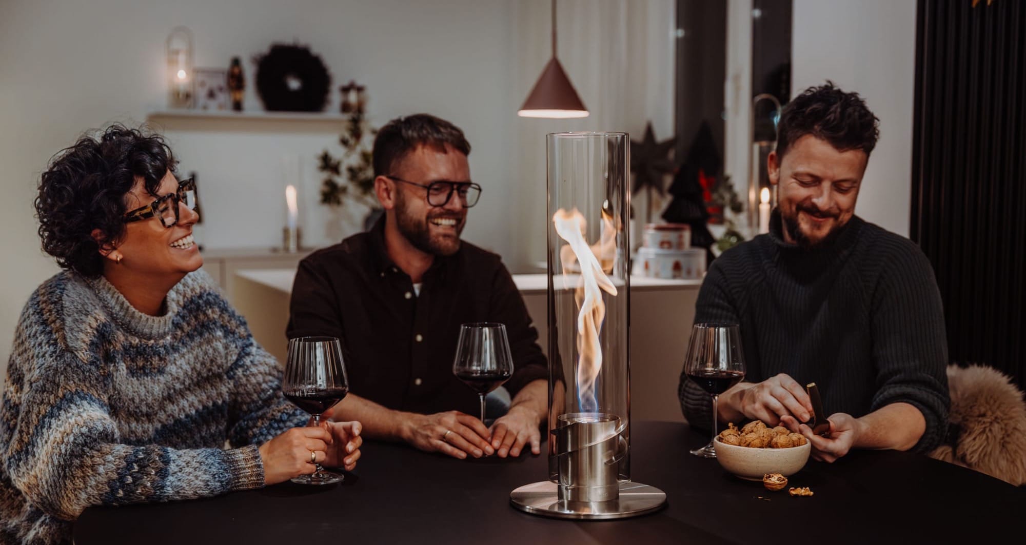 Das Tischfeuer wärmt und sorgt für eine angenehme Stimmung beim geselligen Beisammensein. Das prämierte Design lässt die Flamme im Glaszylinder in einem Wirbel nach oben steigen. Je nach Grösse des Modells können Heizleistungen von 1100 bis 3800 W Wärmeleitung erreicht werden. Als Brennstoff wird Bioethanol verwendet, was beim Verbrennen geruchlos, russfrei und rauchfrei ist.