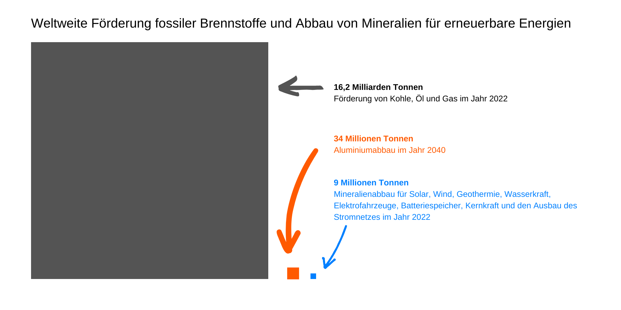 Selbst im Jahr 2024, sind wir mit den Mineralien für die erneuerbaren Energien bei «nur» 28 Millionen Tonnen, im Gegensatz zu den verbrannten 16 Milliarden Tonnen fossile Brennstoffe.